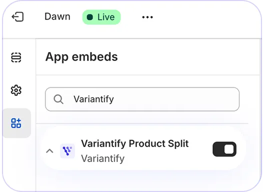Install Variantify from the Shopify App Store and enable the app embed in your theme settings — no coding needed.