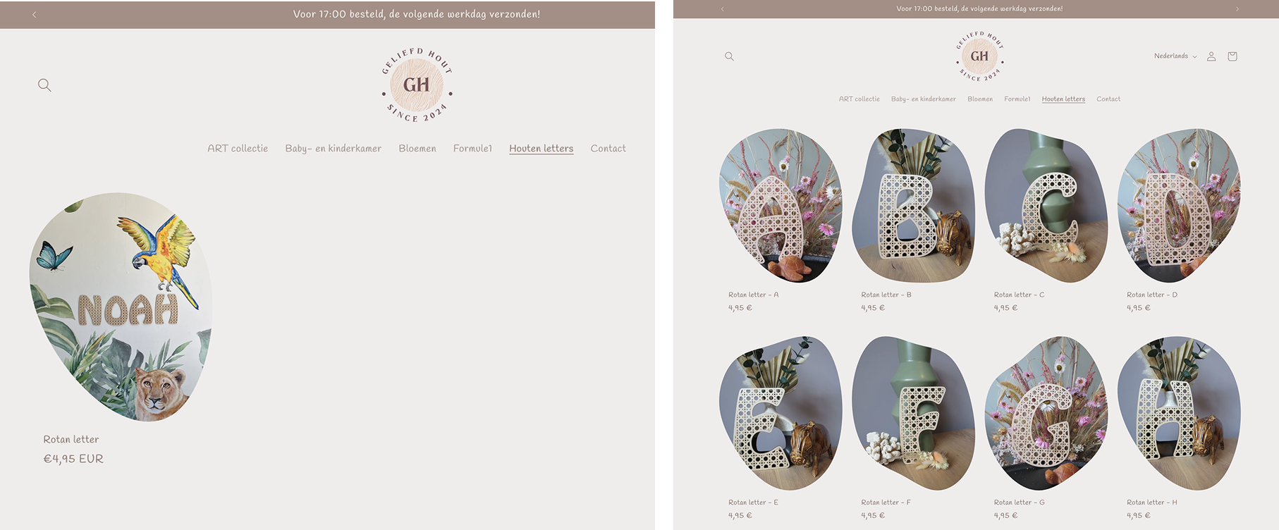 After enabling variant display, Geliefd Hout refreshed their collection page — now each letter variant appears as its own product with its unique variant image.